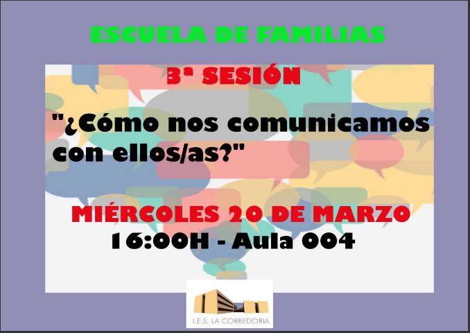 Este Miércoles, día 20 de Marzo, a las 16:00 H, llevaremos a cabo una sesión donde poder reflexionar conjuntamente sobre las dificultades de comunicaciónque tenemos con ellos/as; y compartir, las familias y el profesorado, formas de darles respuesta.
