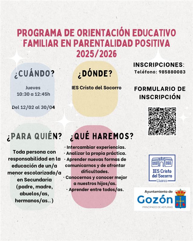 Como ya os anunciamos en las reuniones de inicio de curso, en el IES Cristo del Socorro ponemos en marcha por tercer año el programa de Orientación Educativa Familiar en colaboración con el Ayuntamiento de Gozón.