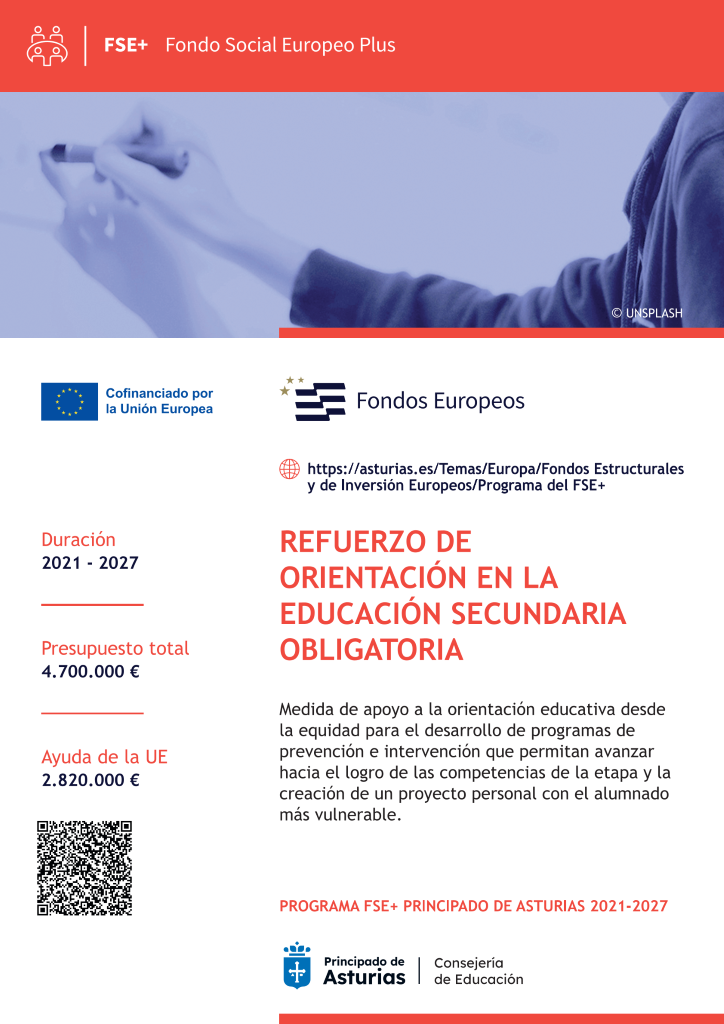 El programa de refuerzo de Orientadores y Orientadoras en Enseñanza Secundaria Obligatoria está cofinanciado por el Fondo Social Europeo Plus en un 60% en el marco del Programa FSE+ Principado de Asturias 2021-2027.