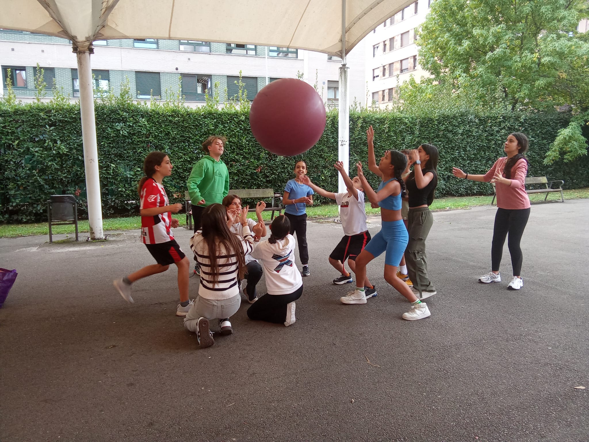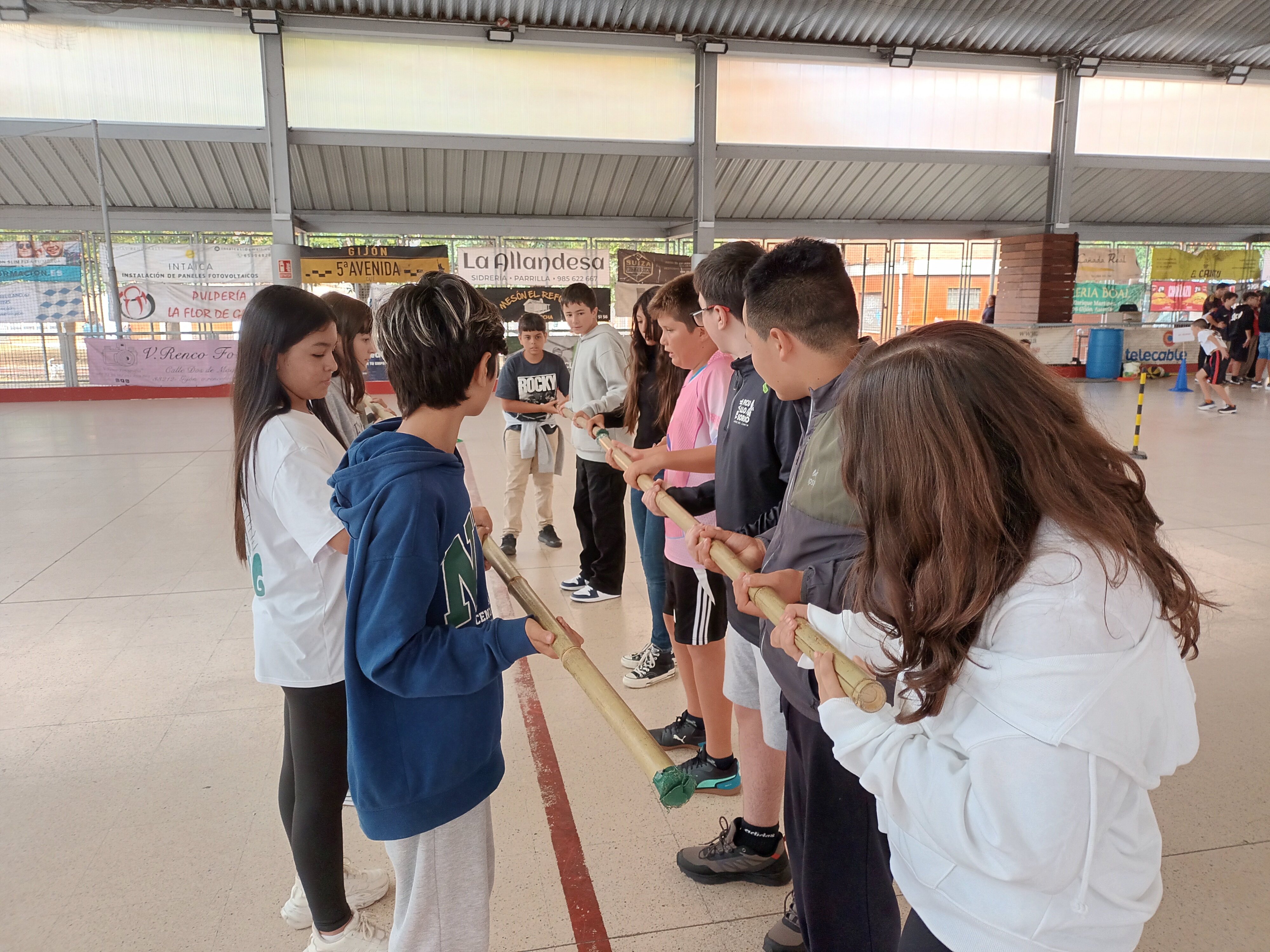 Gynkana de juegos colaborativos con ocho estaciones en la que participan simultáneamente todo el alumnado de 1º.