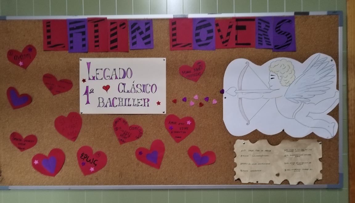 Las alumnas de BH1A-B que cursan la optativa de El legado clásico, realizaron una actividad sobre el amor en la literatura latina, para ello copiaron versos dentro de corazones de cartulina, y añadieron un "pergamino" con la traducción. Completaron el trabajo con un dibujo de Cupido (dios del amor), y el título del trabajo "latin lovers", un juego de palabras con la expresión inglesa.