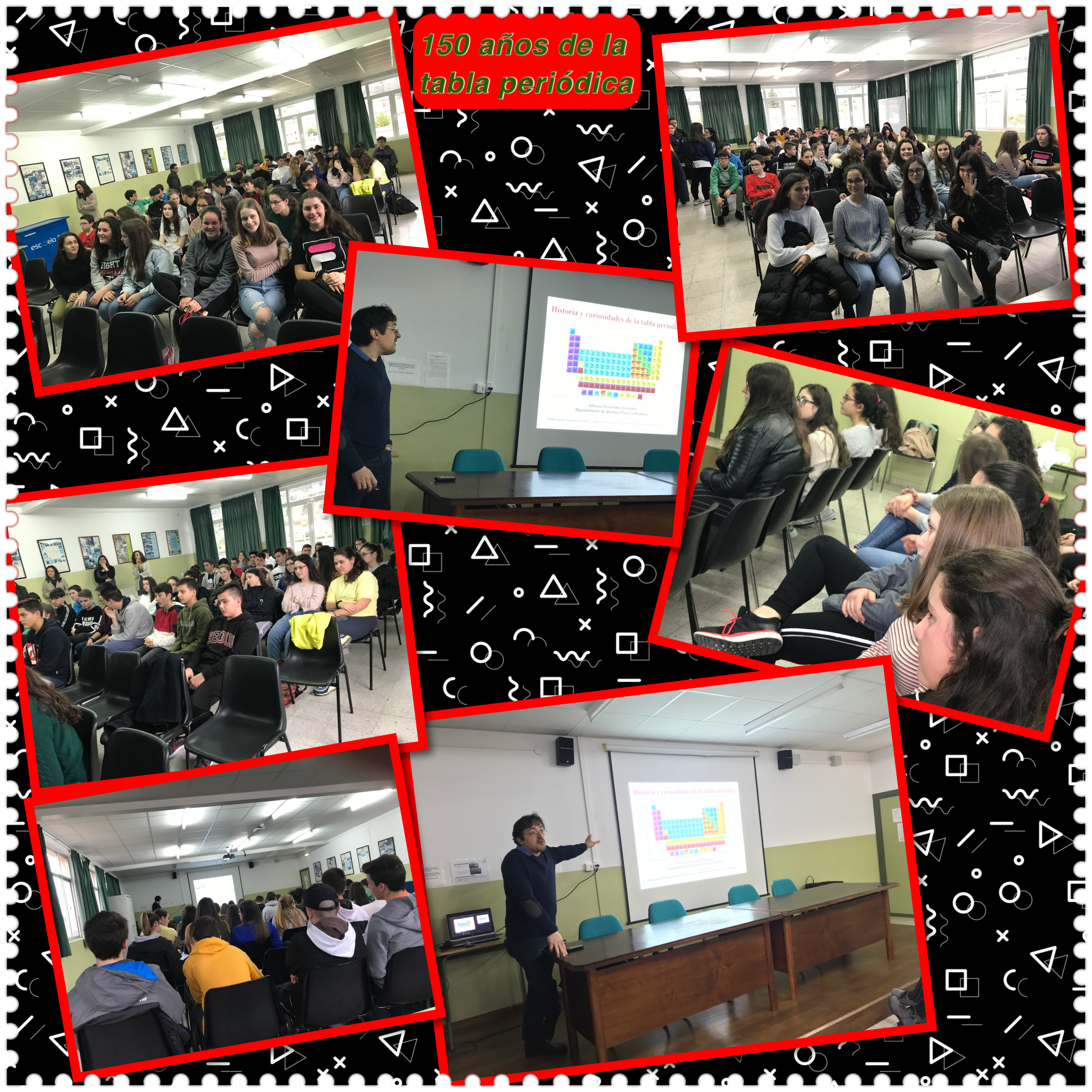 El 30 de enero los alumnos de Física y Química de 3ºESO, 4ºESO y 1º de bachillerato han asistido a la conferencia "150 años de la tabla periódica". El ponente Alfonso Fernández , profesor de la Facultad de Química, realizó un repaso de la historia de este símbolo del lenguaje de la ciencia, desde el concepto de elemento de los griegos, pasando `por los alquimistas hasta la actual representación de la Tabla Periódica promovida por el químico Mendeleiev