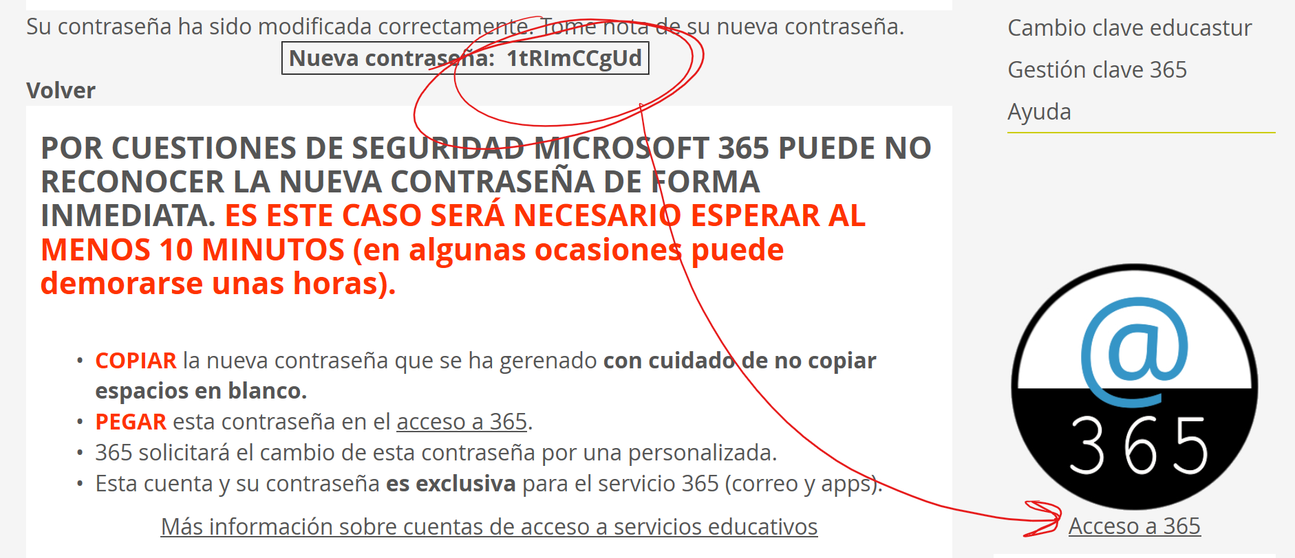 PASO 5.- Copia la nueva Contraseña y accede al enlace "Correo 365". Esta contraseña sirve par un solo uso y deberás cambiarla cuando accedas con ella.
