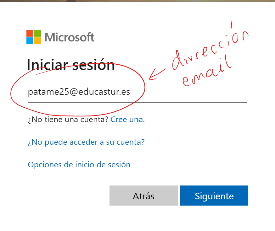 PASO 6.- Iniciar sesión. Introduce tu dirección de email. Fíjate que la dirección se forma con usuario añadiendo @educastur.es
