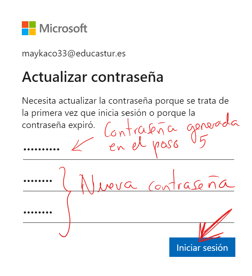 PASO 8.- Actualizar contraseña. Debes introducir primero la constraseña que se generó en el PASO 5 y luego escribir la nueva contraseña que tu elijas. Esta nueva contraseña debe tener alguna letra mayúscula, alguna minúscula y algún número. Mi consejo es que pongas la misma clave de las crendenciales de Educastur cambiando la primera letra a mayúsculas.