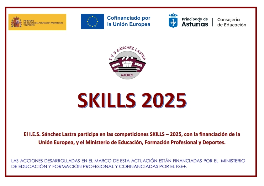 Nuestro centro participa en las competiciones SKILLS 2025, con la financiación de la Unión Europea y el Ministerio de Educación, Formación Profesional y Deportes. Las acciones desarrolladas en el marco de esta actuación están financiadas por el Ministerio de Educación y Formación Profesional y cofinanciadas por el FSE+.