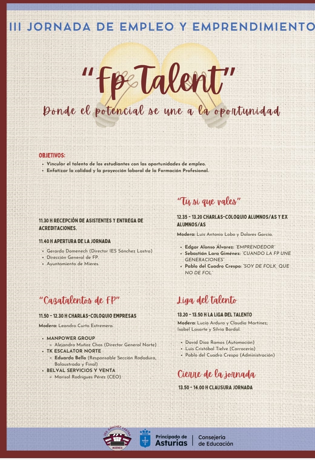 Para ello, contaremos con charlas coloquio con empresas, alumnado y ex alumnado FP. Y, por supuesto, no faltará el talento musical, aportando arte y energía a este encuentro.