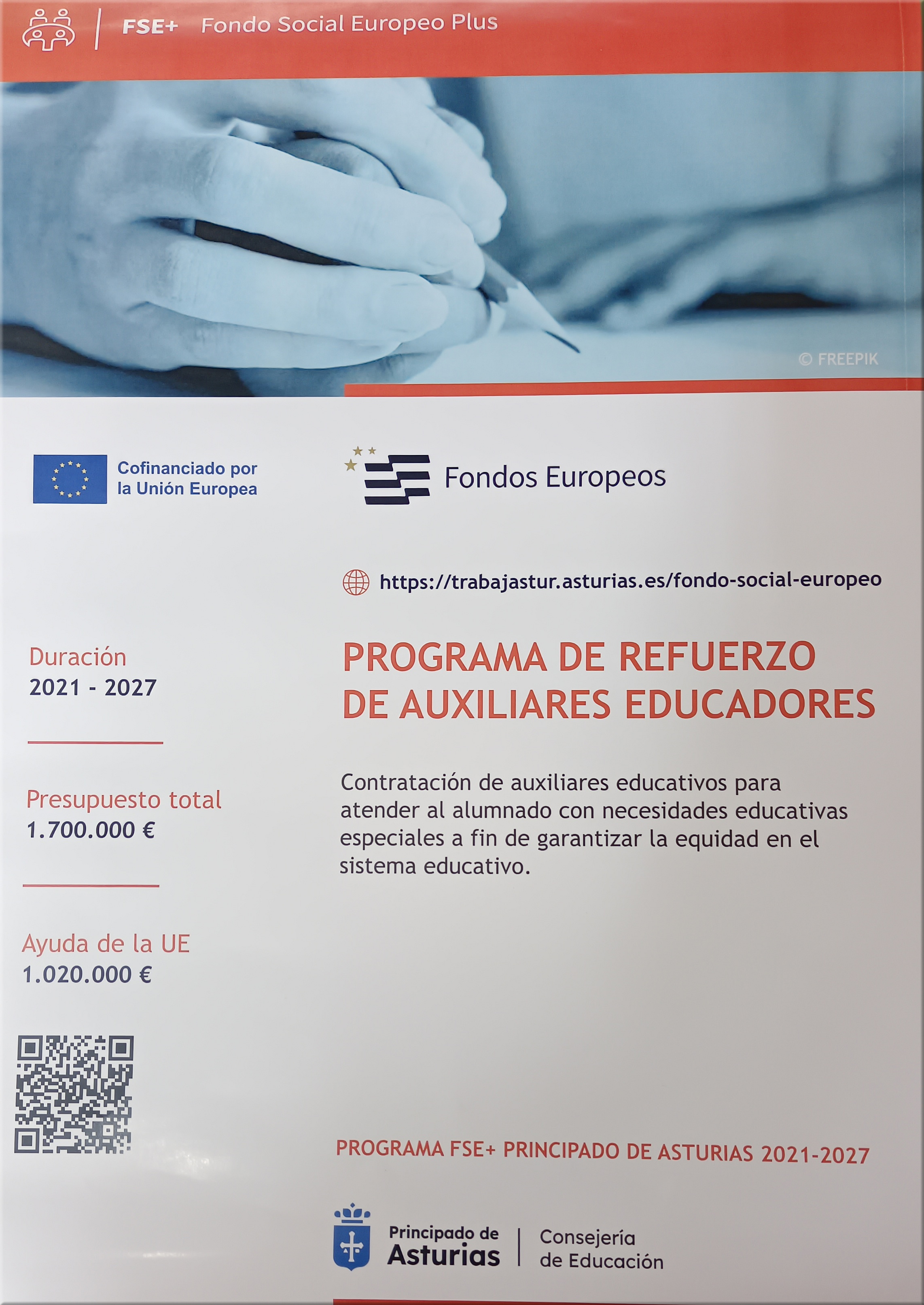 El programa de refuerzo de auxiliares educadores está cofinanciado por el Fondo Social Europeo Plus en un 60% en el marco del Programa FSE+ Principado de Asturias 2021-2027