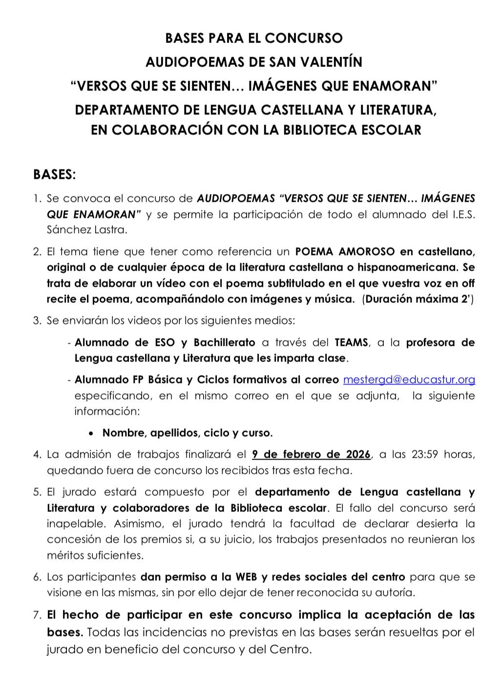 A continuación os presentamos las bases del Concurso "Audiopoemas", organizado desde el departamento de Lengua Castellana y Literatura de nuestro centro. ¡Animaos a participar!