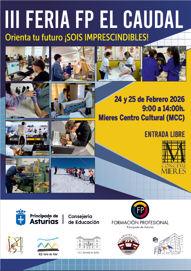 La III Feria de Formación Profesional (FP) "el Caudal" se celebrará en Mieres los días 24 y 25 de febrero de 2026 entre las 9:00 y las 14:00. Este evento de orientación, que se llevará a cabo en el Centro Cultural de Mieres con la participación de distintos centros de la comarca del Caudal, busca acercar la oferta formativa a los jóvenes bajo el lema "Orienta tu futuro, sois imprescindibles".
