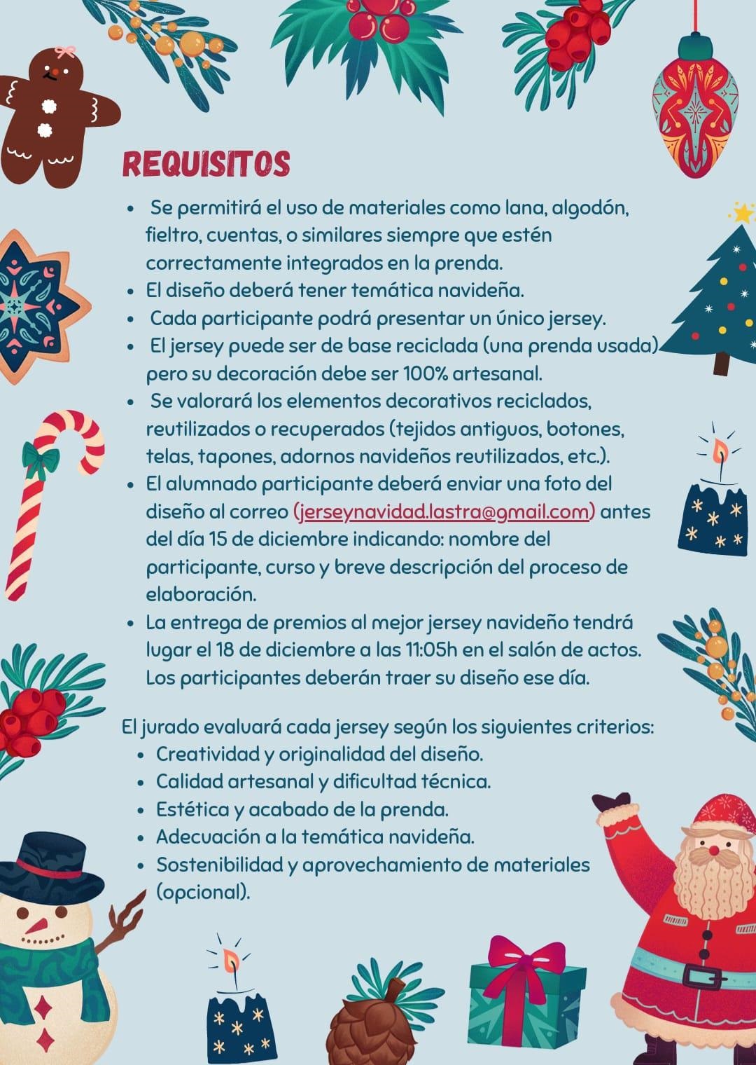 El alumnado participante deberá enviar una foto de su diseño antes del 15 de diciembre al correo del concurso: jerseynavidad.lastra@gmail.com.