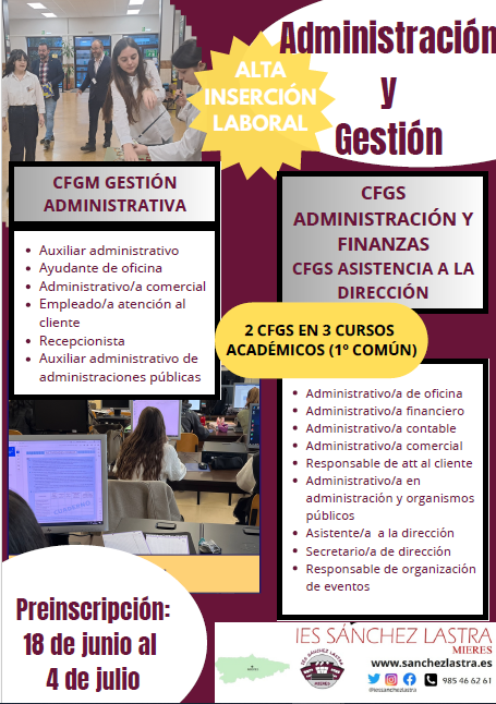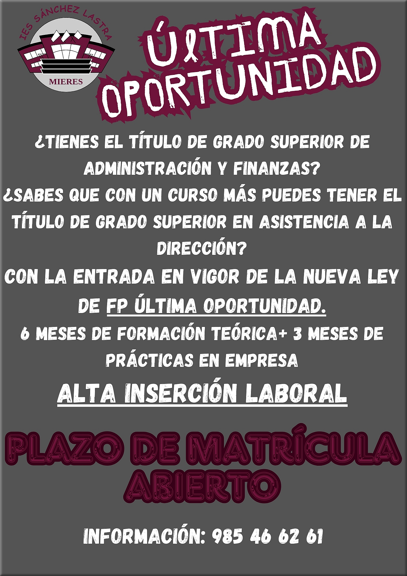 Para todos los que terminasteis el ciclo de Administración y Finanzas en los últimos años, os recordamos que todavía estáis a tiempo de obtener el título de Técnico Superior en Asistencia a la Dirección, accediendo directamente al segundo curso.