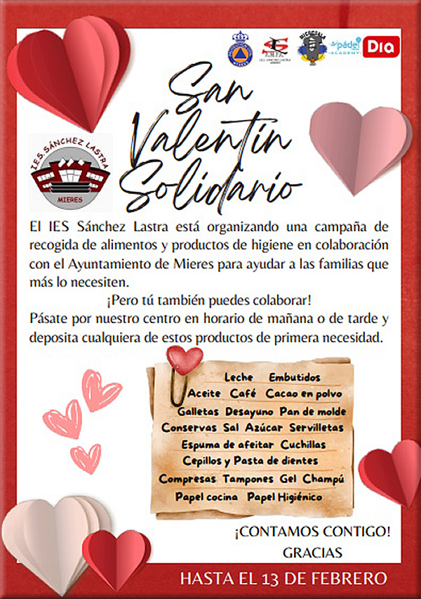 El Departamento de Inglés de nuestro centro, ha decidido celebrar el amor de una forma un poco diferente. Este 14 de febrero celebramos San Valentín de la que creemos que es la mejor manera posible: ayudando a los demás. Por tanto, hemos organizado una recogida solidaria de alimentos no perecederos y productos de higiene personal que se va a desarrollar las próximas semanas en nuestro centro. Colaboraremos con Protección Civil del Ayuntamiento de Mieres.